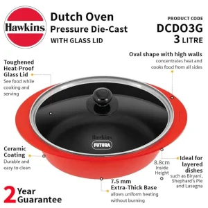 Hawkins Futura Die Cast Dutch Oven 3 Litre with Glass Lid (DCDO3G) – Nonstick, Even Heating, Healthy Cooking