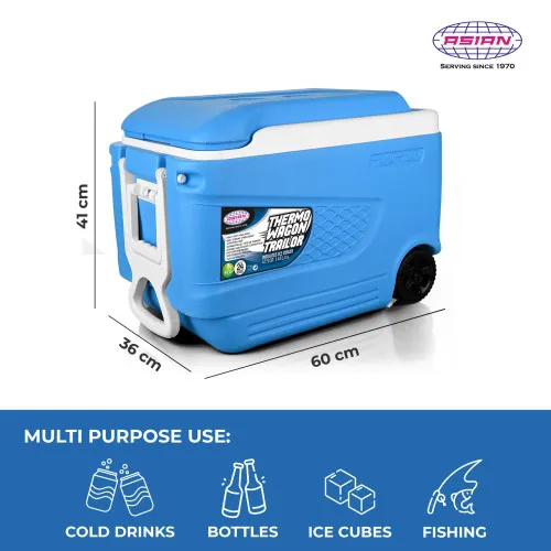 The ASIAN Thermo-Wagon Trailor Ice Cooler 45 Ltr features high insulation, smooth-rolling wheels and a strong handle for easy transport. Ideal for picnic, camping, travel and outdoor adventures. Made in India.