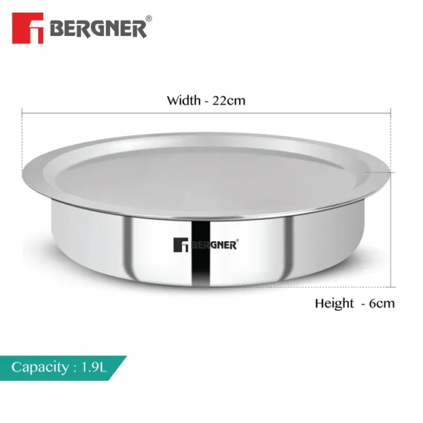 Bergner Argent Tri-Ply Stainless Steel Lagdi 22cm (1.9L) offers durable triply construction with even heat distribution and compatibility with gas and induction cooktops.