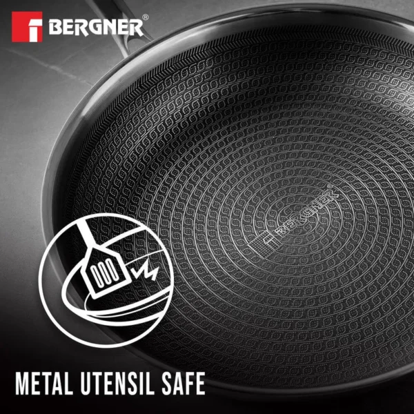 BERGNER Hi-Tech Tri-Ply Stainless Steel Wok 24cm features honeycomb non-stick coating and triply construction for even heat distribution. Ideal for stir-fry cooking with less oil and compatible with gas and induction cooktops.