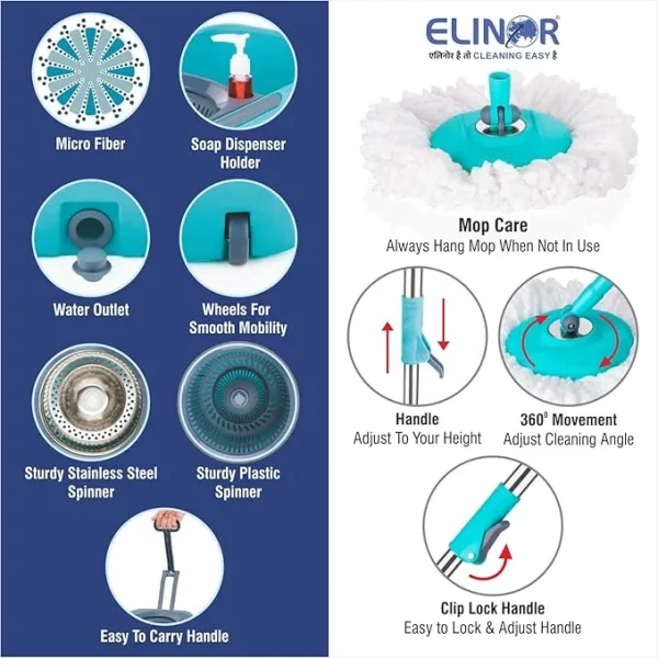 The 360? rotating microfiber mop head easily reaches corners, under furniture, and tight spaces, while effectively removing dirt, dust, and stains. Ideal for tiles, marble, granite, and wooden floors, the Elinor Star Spin Mop is perfect for everyday home cleaning.