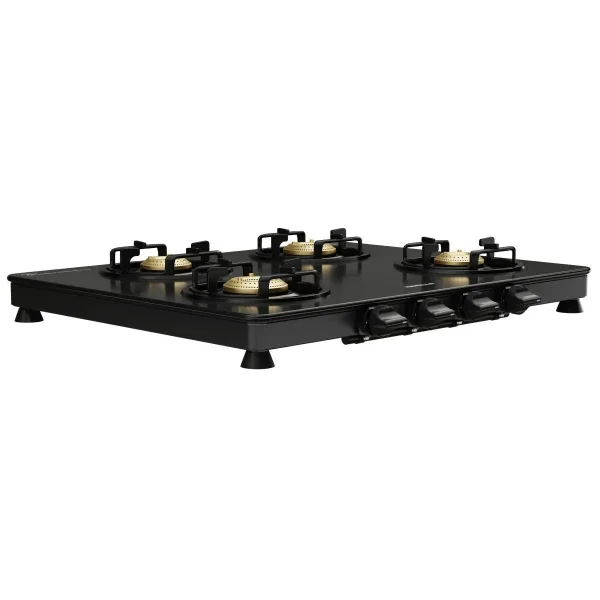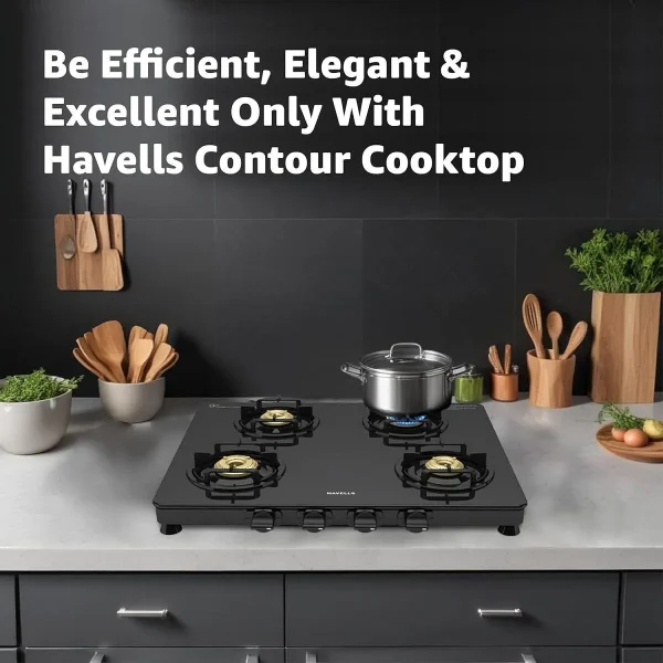 Havells Contour 4 Burner Gas Stove features 8mm toughened glass, durable brass burners, and ergonomic knobs. Designed for efficiency and stability, it is perfect for large families and modern kitchens.5