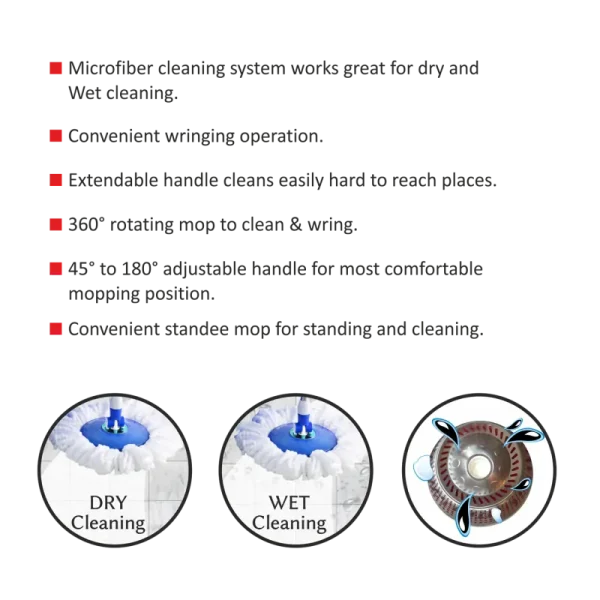 he Kleeno Super Clean Spin Mop Steel Jali with 1 Extra Refill brings a new level of convenience and efficiency to your home cleaning routine. Its 360? rotating microfiber mop head easily reaches tight corners, under furniture, and along wall edges for a thorough clean every time.