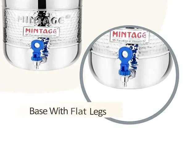 The Mintage Stainless Steel Hammered Matka With Tap (25 No. – 23 Litre) is designed for stylish and hygienic drinking water storage. Made from high-quality stainless steel, this matka features a beautiful hammered finish that adds elegance to your kitchen or dining area.