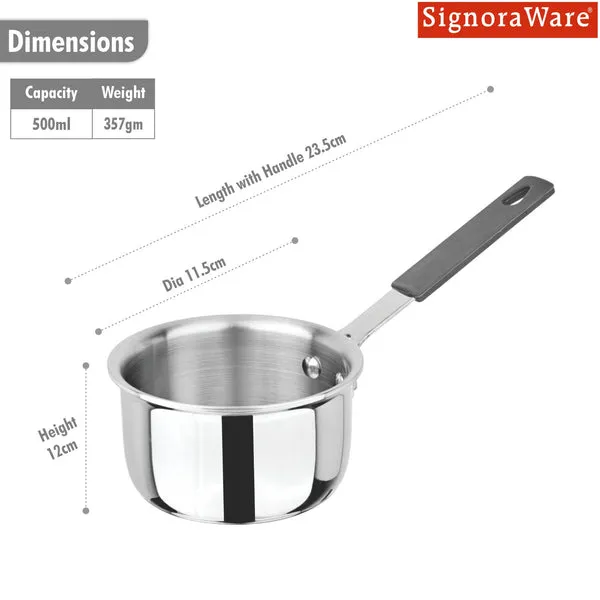 Signoraware Artista Tri-Ply Mini Saucepan 500ml features premium triply stainless steel construction for even heating. Ideal for boiling milk, sauces and small portions, compatible with gas and induction cooktops.