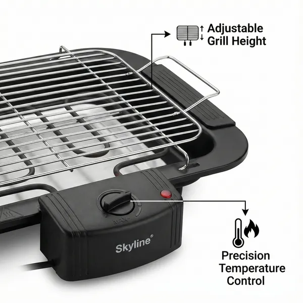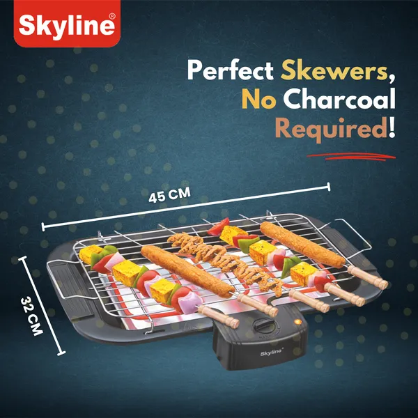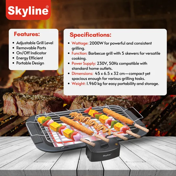 Skyline Electric BBQ Grill with 5 skewers (VTL-4545) is a 2000W portable barbecue grill designed for easy and energy-efficient grilling at home.