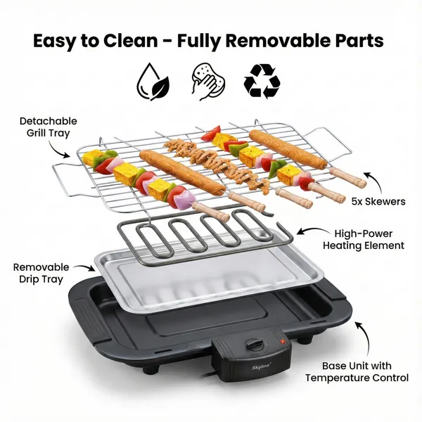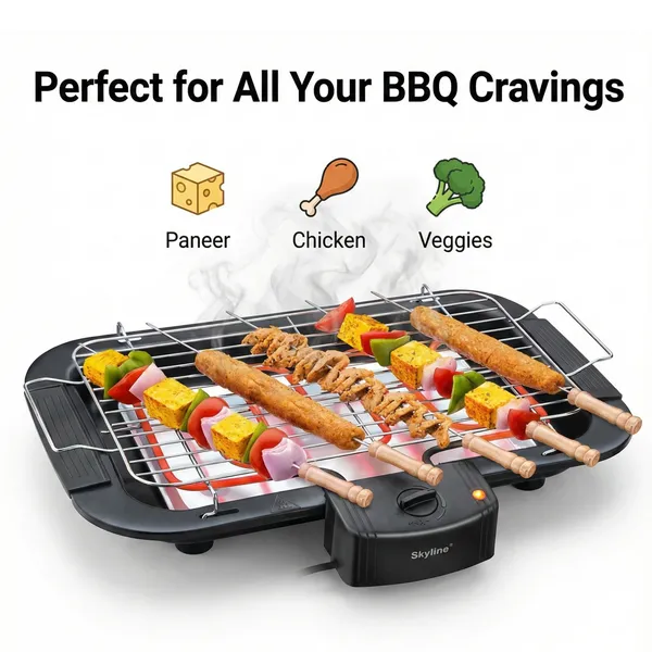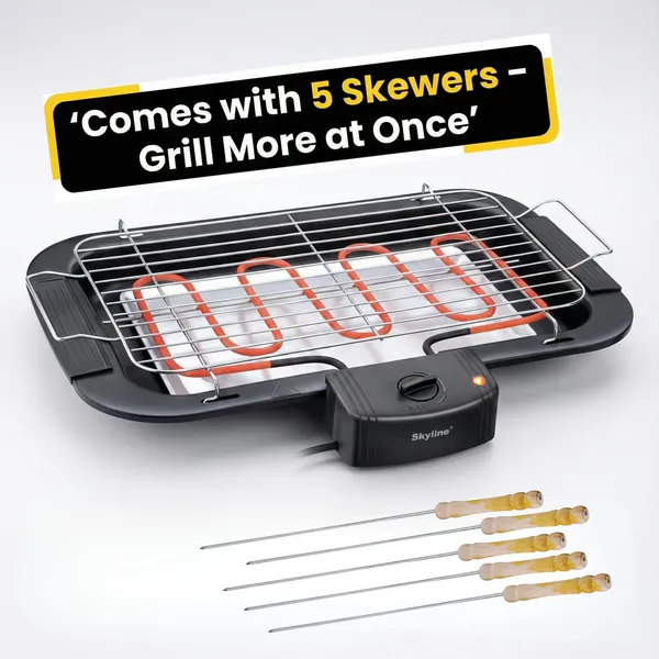 This electric barbecue grill includes 5 skewers, making it ideal for preparing paneer tikka, kebabs, vegetables and other grilled snacks. Its portable and compact design allows easy placement in kitchens, balconies or outdoor gatherings.