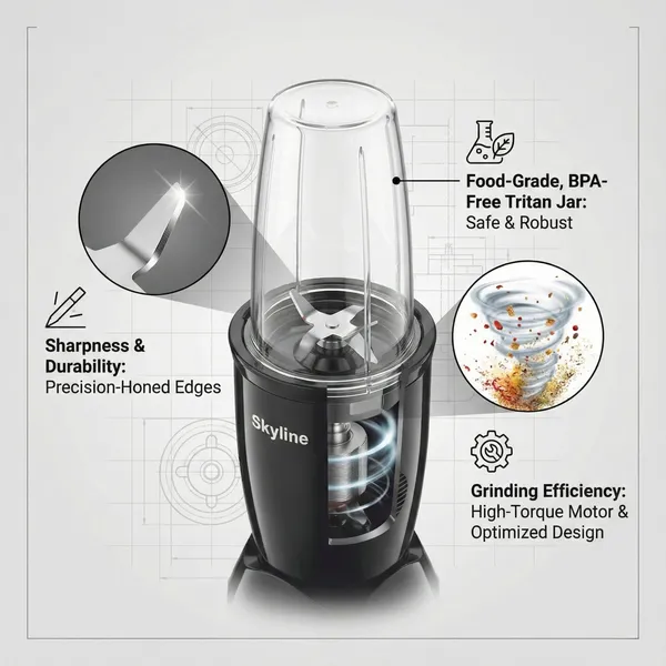 Skyline Nutri Mix Pro 500W Mixer Grinder (VTL222) is a compact and durable multi-purpose kitchen mixer designed for grinding spices, making chutneys and blending smoothies.