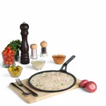 Vinod cast iron kadai with lid offers excellent heat retention and durability. Pre-seasoned for natural cooking, it is ideal for frying, curries, and everyday use on gas and induction.